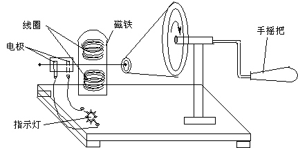 摇动发电机,看到灯泡发出闪光,若加快摇动的速度,闪光逐渐变成连续,并且亮度逐渐增加。这是由于转速越快,单位时间内的磁通量变化越大,因而感生电动势越大,灯泡亦越亮。 |