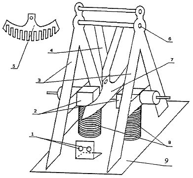 阻尼摆与非阻尼摆演示仪,如图66-1所示。其中①直流电源接线柱;②矩形磁轭,作用是当线圈中通有直流电源时,可在磁轭两极缝隙中间产生很强的磁场;③支撑架;④摆架;⑤非阻尼摆;⑥横梁;⑦阻尼摆;⑧线圈;⑨底座。直流稳压电源。