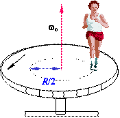 例:匀质园盘(m、R)与一人(m/10,视为质点)一起以角速度wo