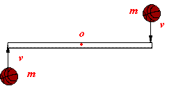 转动,杆与桌面间的摩擦系数为µ,起初杆静止。桌面上有两个质量均为m的小球,各自在垂直于杆的方向上,正对着杆的一端,以相同的速率v相向运动,并与杆的两端同时发生完全非弹性碰撞(设碰撞时间极短)。