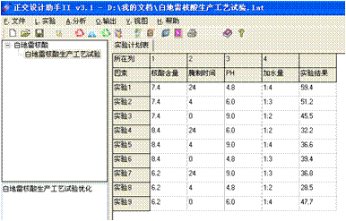 - 试验目的:生产中存在的主要问题是出率低,质量不稳定,经过问题分析,认为影响出率、质量的关键在于调粉、糖化这两个工段,决定将其它工段的条件固定,对调粉、糖化的工艺条件进行探索。