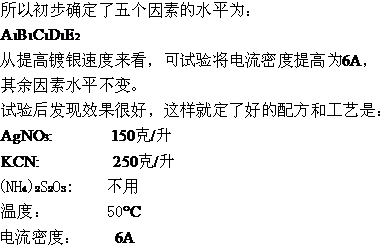 - 根据正交设计法:对配方选取六因素五水平的正交试验表,实验以电沉积速度和合金镀层光亮度为指标。