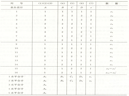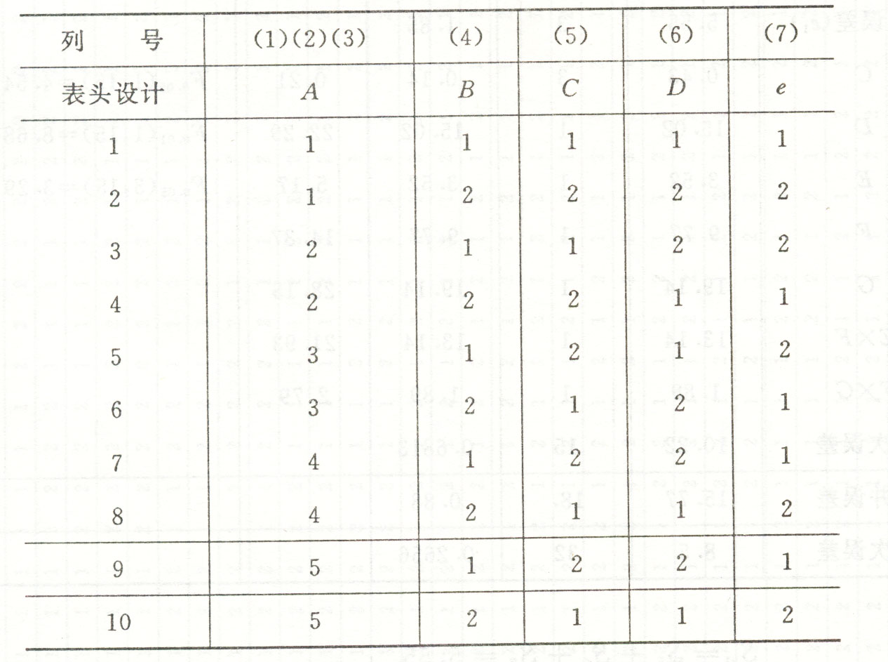 - 某试验中,因素A为五水平,B、C、D为两水平。A的1~4四个水平采用本章第二节的方法安排在内(1)~(3)列组成的四水平新列内,A5则将4水平再重复两次,即第9、10两次试验,这样就完成了部分追加法试验设计。