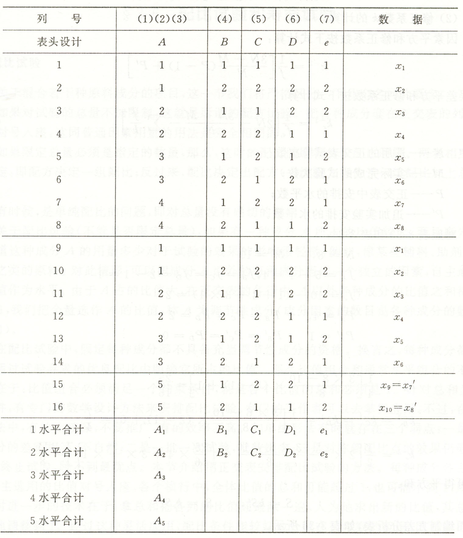 - 第1、2列的水平号从上往下是成对的出现。我们把因素A、B、C分别配置在1、2、3列上。剩下的配D、E,如6、7列。